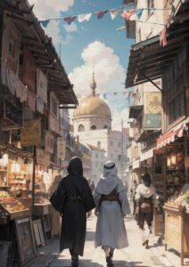 - 幻想世界の風景『異国の市場通りを旅する』【塗り絵の無料ダウンロード】- 印刷・商用利用可