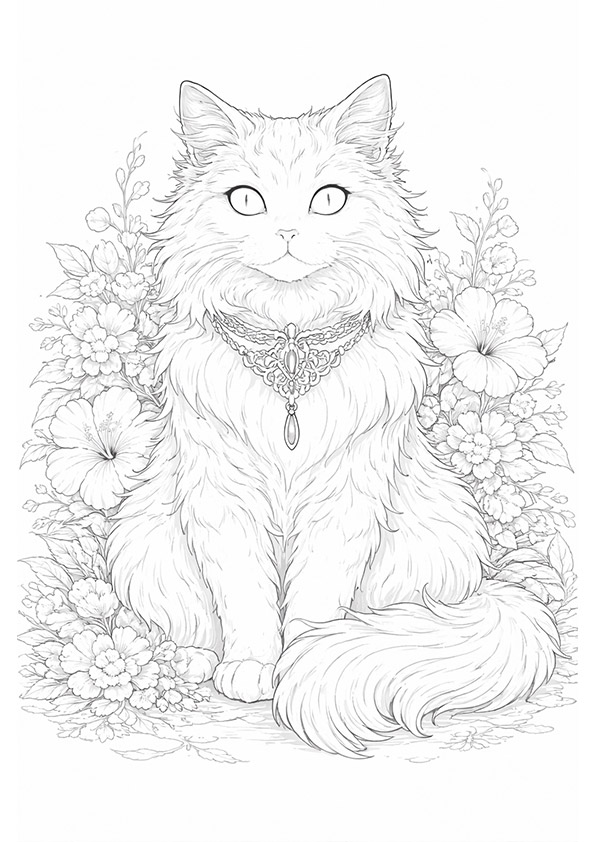 花に囲まれて佇む猫を描いた、大人向けの線画塗り絵です。長い毛並みや装飾の細かなラインは、色を重ねるほど立体感が生まれ、落ち着いた時間を楽しめます。花の配色で雰囲気が変わるため、やわらかなパステルから深い色合いまで自由に表現できます。印刷してすぐに塗り始められます。