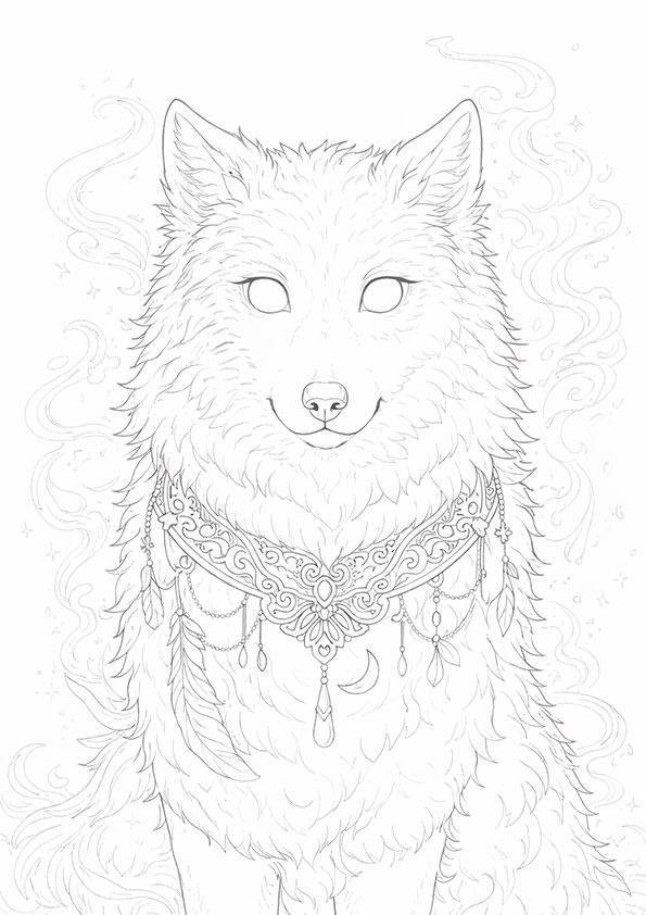 細かな装飾と柔らかな毛並みが楽しめる、大人向けの落ち着いた塗り絵です。静かな時間をつくりたいときにも向き、色選びによって神秘的にも温かな雰囲気にも仕上がります。自由な発想で彩り、自分だけの守り狼を完成させてください。