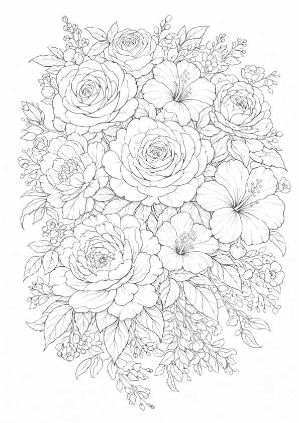 『華やかな花束のボタニカル』花・植物の塗り絵