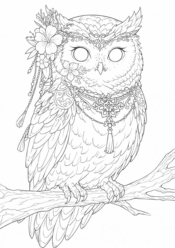 繊細な装飾をまとったフクロウを描いた線画の塗り絵です。羽の重なりやアクセサリーの細部まで丁寧に描かれており、落ち着いた時間の中でゆっくり色を重ねていく楽しさが味わえます。落ち着いた配色にも鮮やかな色遊びにも向く一枚で、大人の集中時間や気分転換にぴったりです。