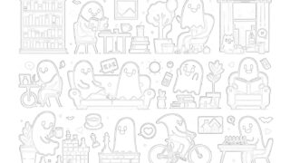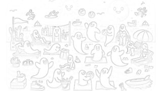 かわいい塗り絵 『ハロウィンナイトのおばけたち』- 可愛いおばけの塗り絵 – ドゥードゥルアート【図柄無料ダウンロード】- 印刷・商用利用可