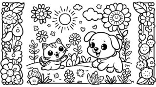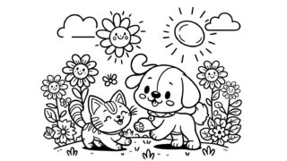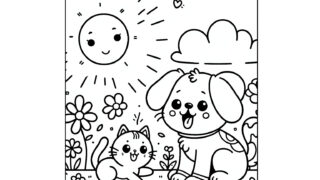 かわいい塗り絵 犬と猫の塗り絵『お日様の下で遊ぶ仲良し猫と犬』【子供向け図柄の無料ダウンロード】- 印刷・商用利用可 【子供向けの塗り絵】無料でダウンロード&印刷可能!無料で使える犬と猫塗り絵です。動物、自然、乗り物など、子供たちが喜ぶ多彩なテーマの塗り絵を提供しています。想像力と創造性を育む楽しい活動で、お子様の色彩感覚と手先の器用さを向上させましょう。 かわいい塗り絵塗り絵子供の塗り絵子供の塗り絵-動物