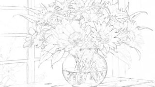 塗り絵 『花』大人の塗り絵【無料】- 窓辺のガラス花瓶に生けられた花 無料で使える大人の塗り絵です。ご自由にダウンロード・プリントしてお使いください。花やカラフルなデザインが満載の当コレクションは、ご自宅で簡単にプリントアウトして、創造性を発揮するひとときを提供します。日々のストレスを解放し、美しいアート作品を創り出すことで、心の平和を見つけてください。 塗り絵大人の塗り絵花 - 大人の塗り絵