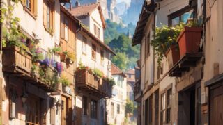塗り絵 幻想世界の風景『商店街の風景』【塗り絵の無料ダウンロード】- 印刷・商用利用可 【無料の塗り絵】無料で使える幻想世界の建物の塗り絵です。幻想的な街並みを描いた塗り絵を無料で配布中。優しい光と花が彩る夢のような路地をお楽しみください。 塗り絵大人の塗り絵子供の塗り絵